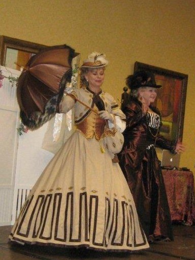 While everything from my erotic authors panel to the erotic author mixer and the book “rumble” on Sunday was fantastic, I would have to say the highlight of the weekend was the Victorian Fashion Show put on by Deeanne Gist. She was extremely knowledgeable about the subject and the dresses were fabulous. The first portion of the event was a parade of historical authors dressed in period pieces. I’ve got a few sample photos provided by Ellen Higuchi (because I was a dork and forgot to put my camera in my bag!)